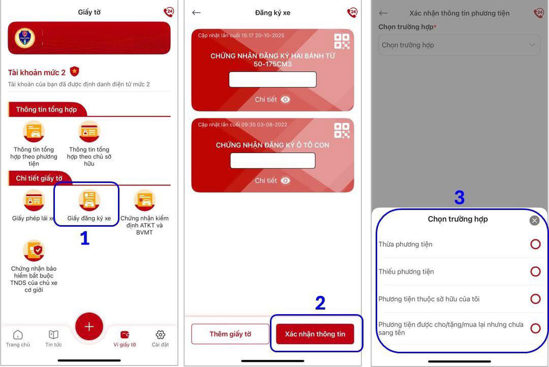 Cũng theo đại diện Cục CSGT, đối với trường hợp phương tiện do người dân đứng tên trên giấy đăng ký xe nhưng đã bán, cho, tặng, chuyển quyền sở hữu mà chưa làm thủ tục thu hồi biển số (hoặc sang tên, chuyển chủ); hoặc phương tiện bị mất cắp nhưng chưa trình báo, người dân đã có tài khoản VNeTraffic mức độ 2 có thể thực hiện khai báo theo 8 bước.