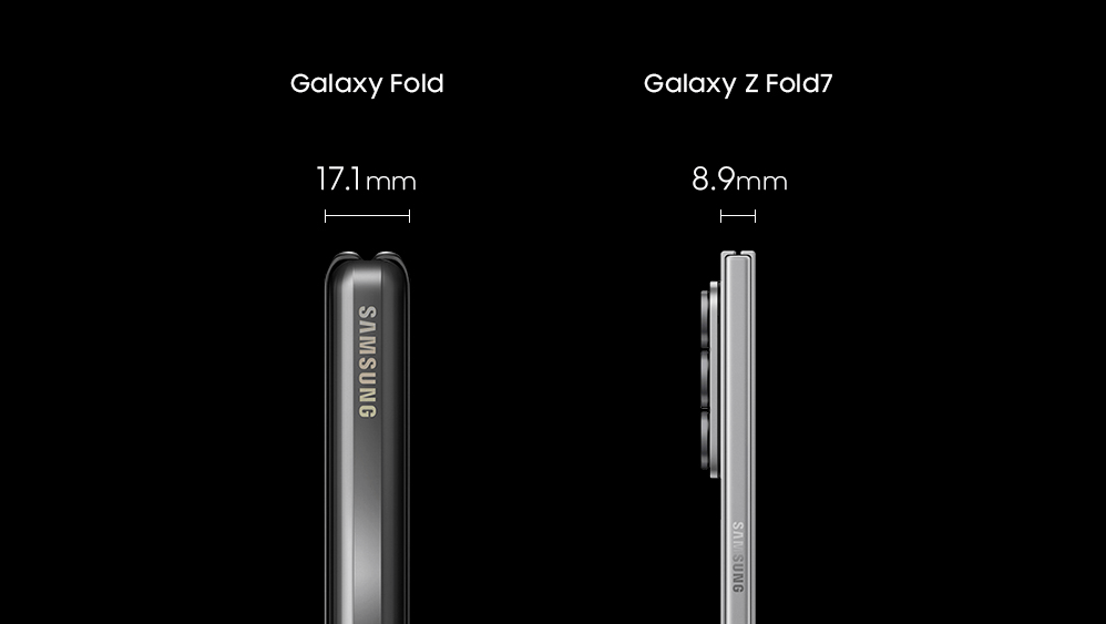 Galaxy Fold đầu tiên của Samsung Electronics dày 17,1 mm và Galaxy Z Fold7 dày 8,9 mm. Ảnh: Samsung
