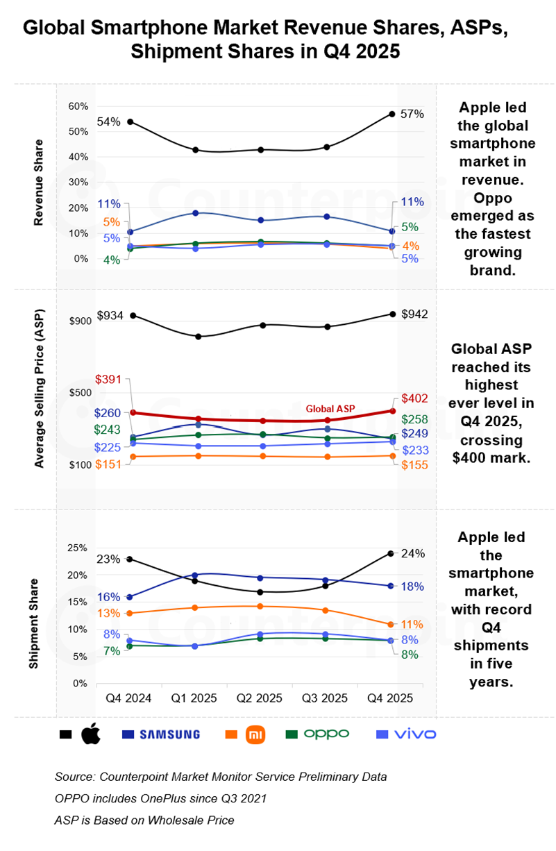 Giá bán trung bình của smartphone toàn cầu Quý IV/2025 (dựa trên giá bán buôn) lần đầu vượt mốc 400 USD. Nguồn: Counterpoint