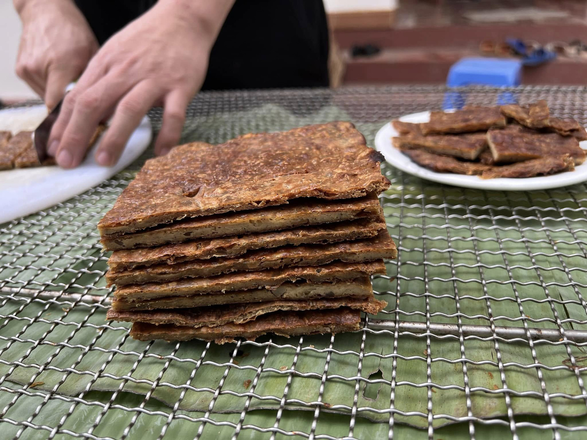 Tiếp đến, người ta đổ hỗn hợp thịt giã nhuyễn lên lá chuối hoặc giấy bạc, dàn thật mỏng cho vuông vức, phẳng đều rồi úp một lớp lá chuối nữa lên.