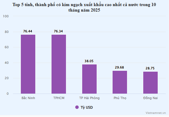 Con số xuất khẩu đạt 76,44 tỷ USD đã đưa Bắc Ninh vươn lên dẫn đầu cả nước trong 10 tháng năm 2025, chính thức vượt qua TPHCM.