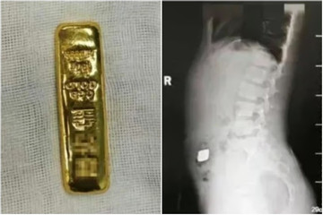 Tuy nhiên, sau 2 ngày, chụp X-quang một lần nữa, các bác sĩ thấy vật lạ vẫn "án binh bất động". Họ đành tiến hành phẫu thuật để lấy dị vật ra. Kết quả cho thấy, dị vật là một thỏi vàng nặng 100g.