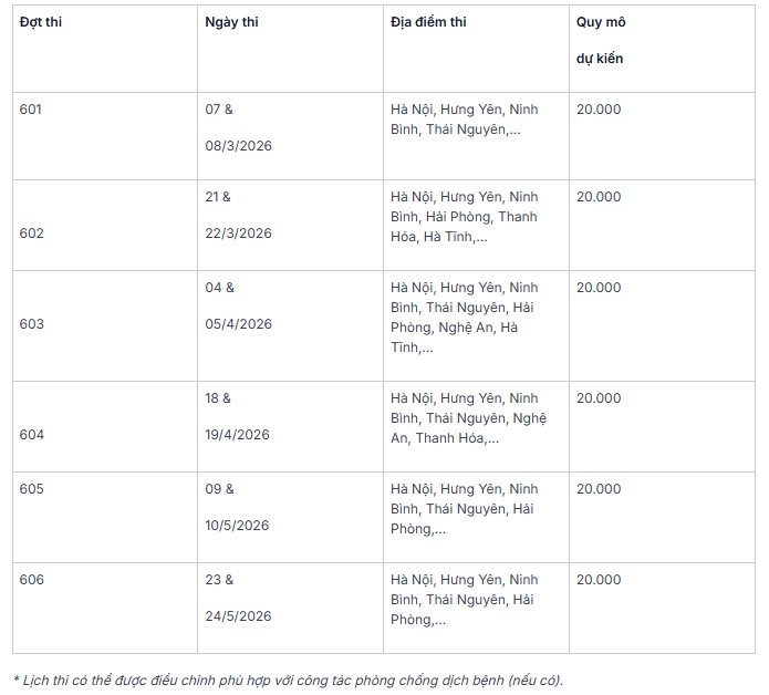 Năm 2026, các đợt thi Đánh giá năng lực của ĐH Quốc gia Hà Nội diễn ra từ ngày 7/3 đến ngày 24/5/2026 tại Hà Nội, Thái Nguyên, Hải Phòng, Hưng Yên, Ninh Bình, Thanh Hóa, Nghệ An, Hà Tĩnh…